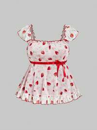 Kawaii Camicia a tema "Doll" con stampa a fragole, pizzo a contrasto, adatta per vacanze, ideale per primavera/estate, taglie comode