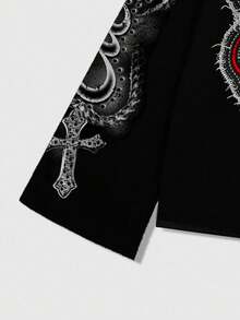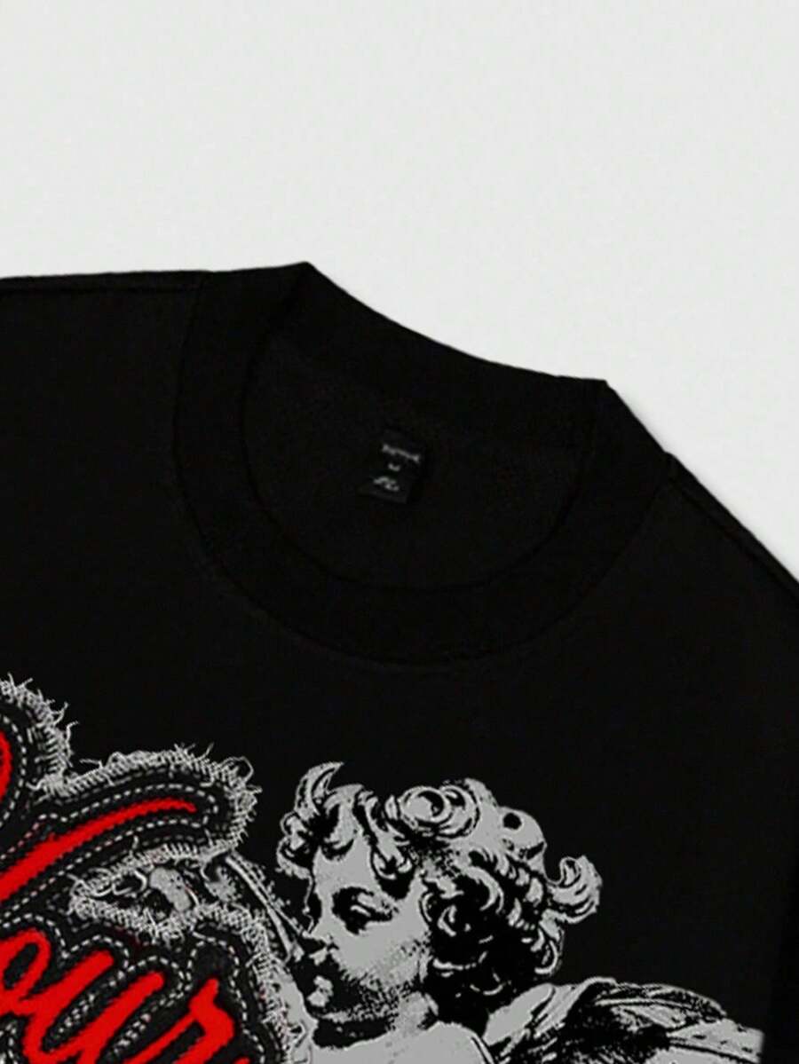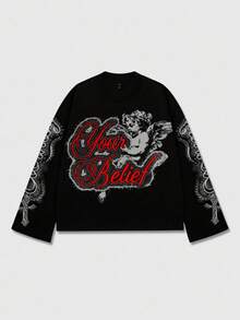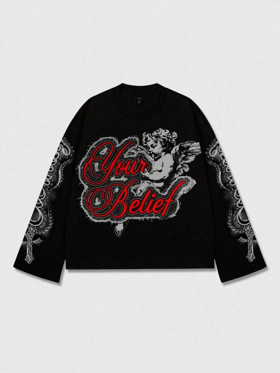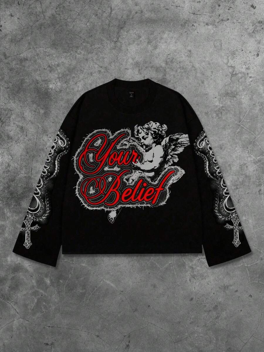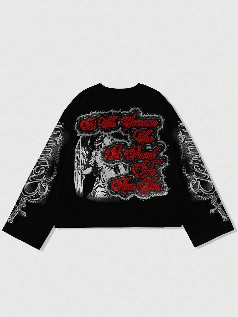 Maglietta a maniche lunghe nera con stampa di lettere angeliche, autunno/inverno, da uomo