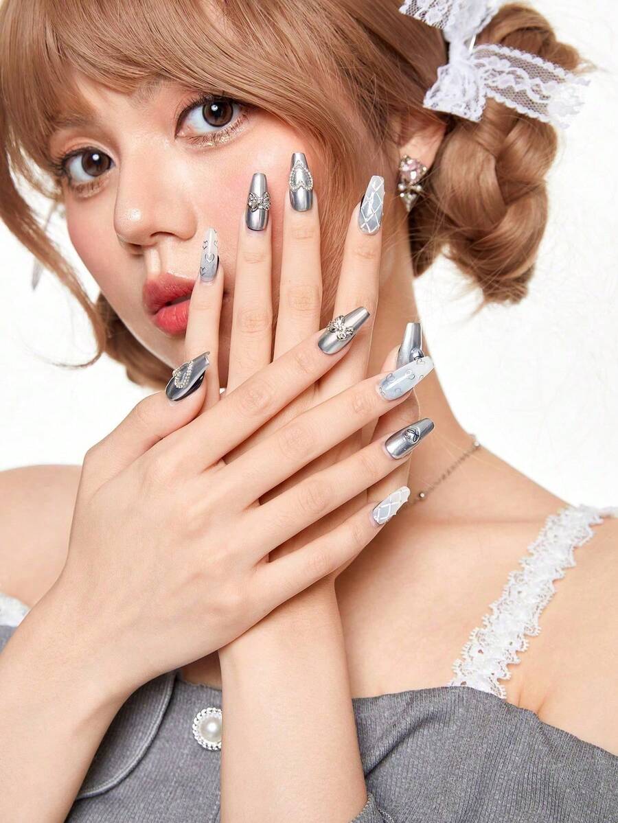 Kawaii 10 pezzi di unghie finte punk realizzate a mano + 3 pezzi di nastro biadesivo, unghie finte in metallo con elemento decorativo a fiocco in stile Y2K, di alta qualità, rimovibili e con foro, a forma di mandorla media, adatte per feste, balli e uso quotidiano.