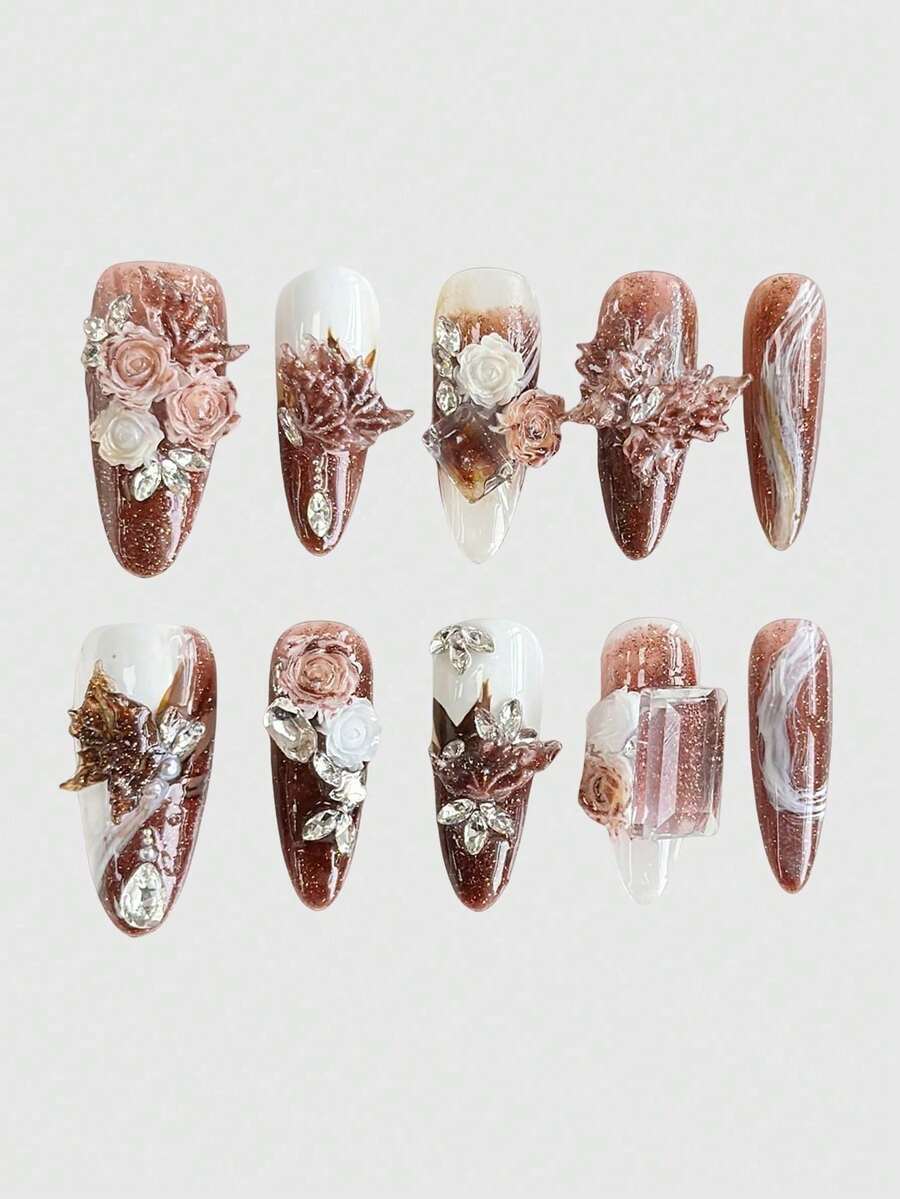 Anime 10 pezzi di unghie finte a forma di foglia d'acero tridimensionale dipinte a mano di alta qualità + 3 fogli di nastro biadesivo, unghie riutilizzabili con cristalli a forma di farfalla e rose, forma mandorla media, adatte per feste, balli e uso quotidiano.