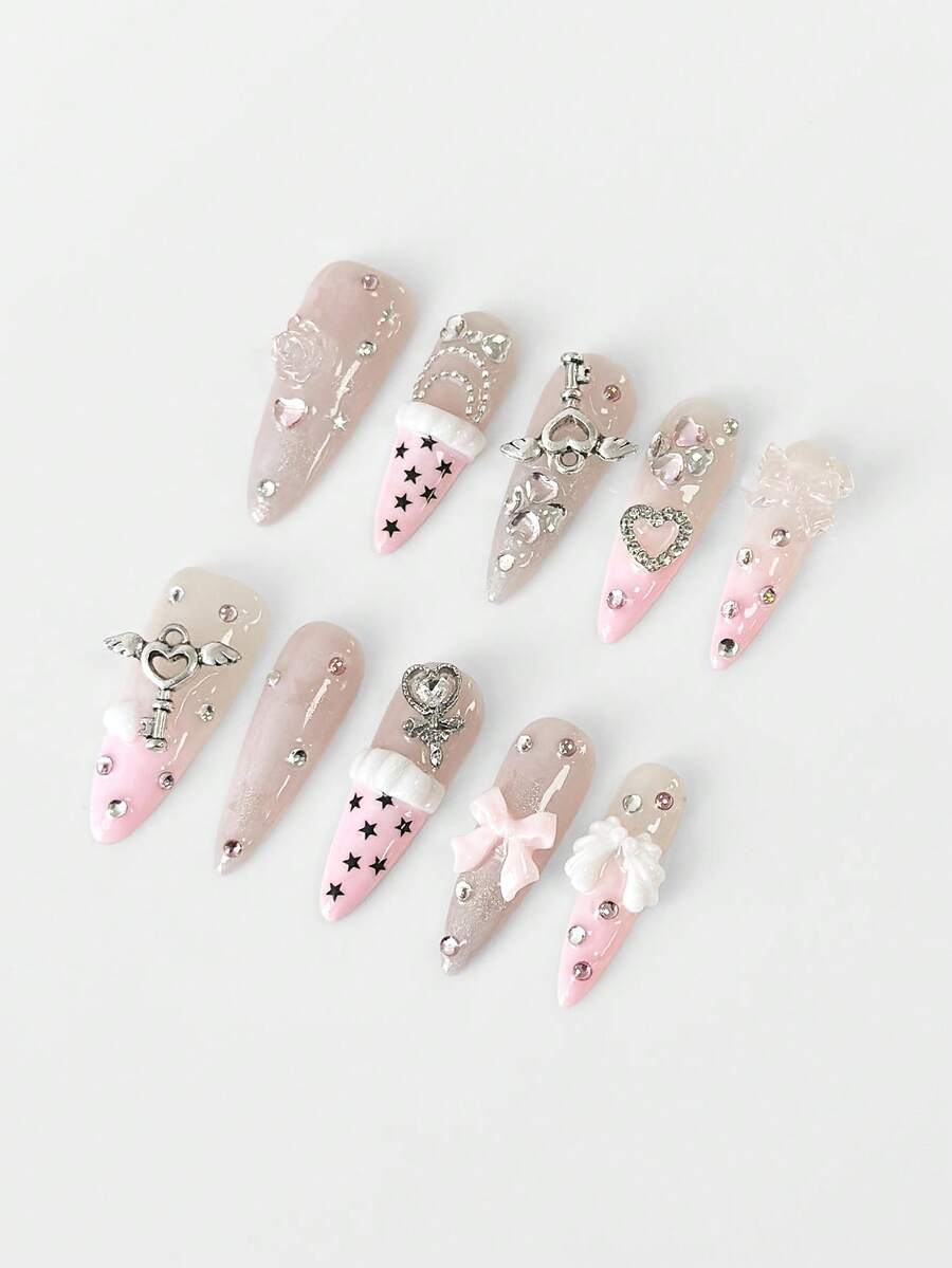 Anime 10 pezzi di unghie finte di alta qualità, decorate con elementi romantici come fiocchi, rose, stelle e quadrifogli, con 3 pezzi di nastro biadesivo. Unghie a forma di mandorla, lunghe e glitterate, adatte per feste, balli e uso quotidiano.