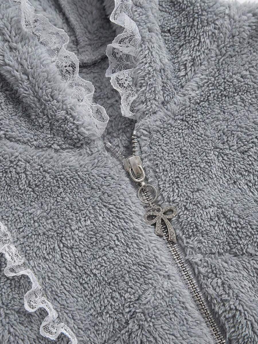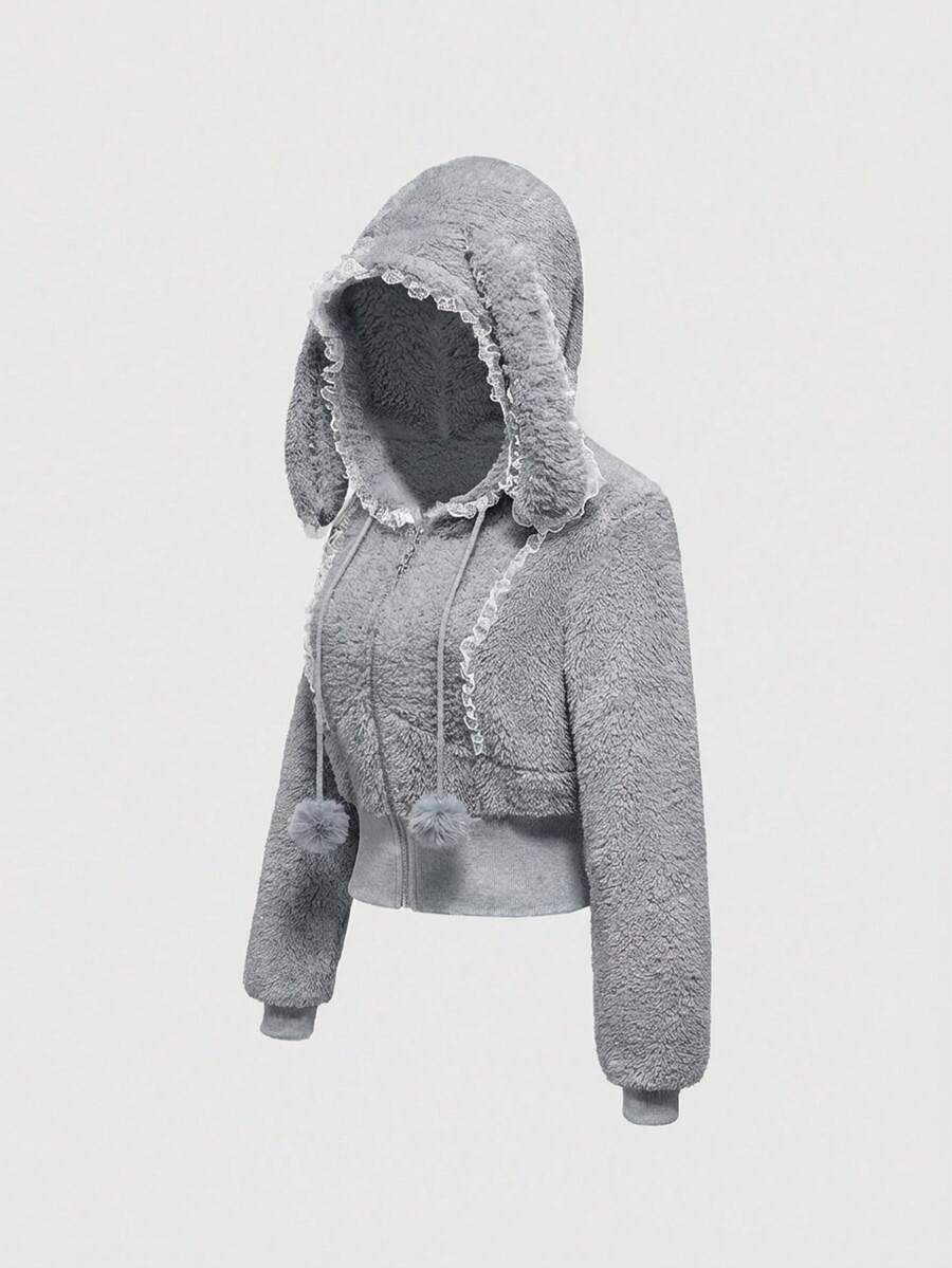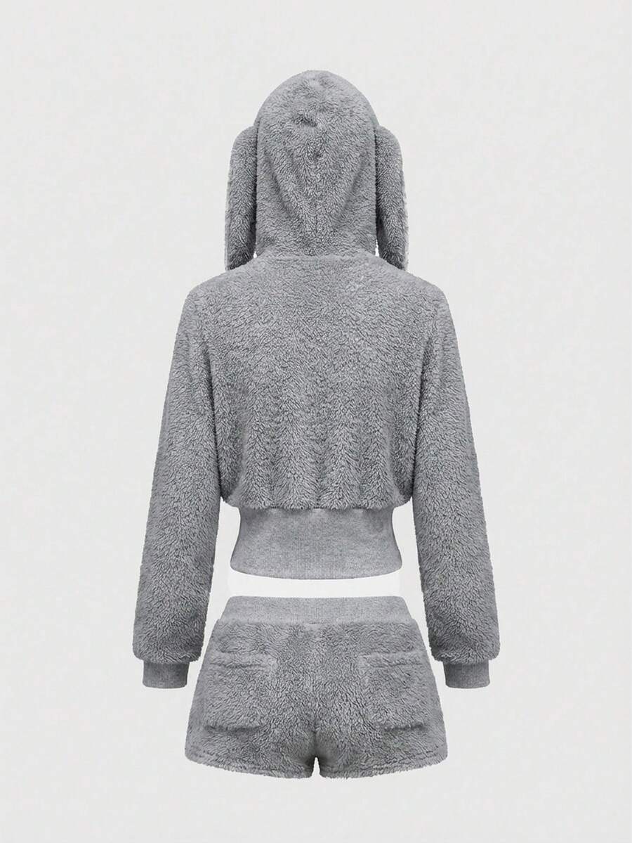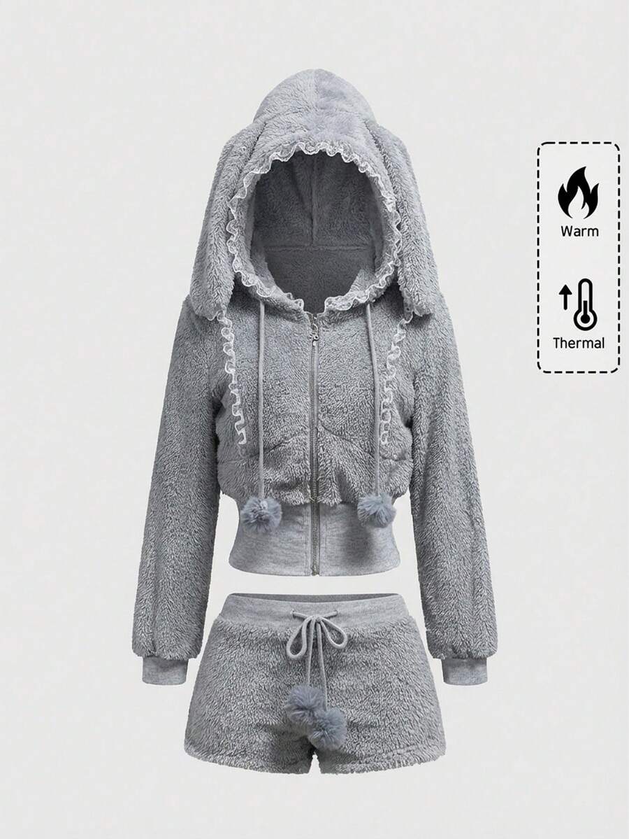 Set da 2 pezzi composto da felpa con cappuccio e orecchie da coniglio in pizzo e piumino, e pantaloncini soffici, stile kawaii, per l'autunno/inverno per donne