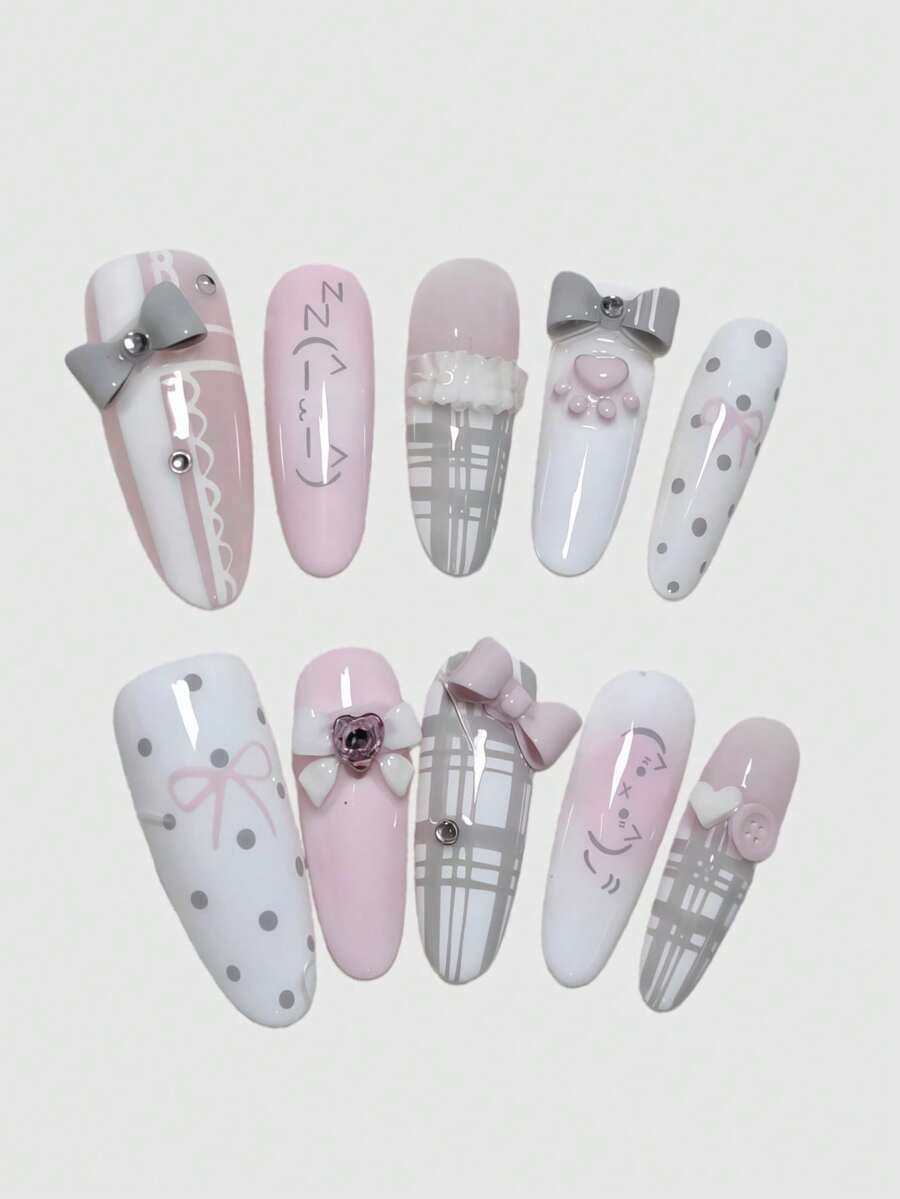 Anime 10 pezzi di unghie finte decorative in stile retrò Y2K, con motivi a stelle, pois, righe, pop art, grunge, note musicali, fatte a mano, adatte per college, festival musicali, appuntamenti, ecc.