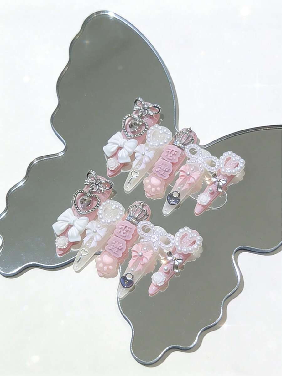 Kawaii 10 pezzi di unghie finte decorate a mano con personaggi carini + 3 nastri biadesivi, fiocchi, cuori, rose, artigli di gatto, corone, strass, unghie a mandorla lunghe dipinte, con armatura, glitter viola di alta qualità, adatte per feste, balli e uso quotidiano