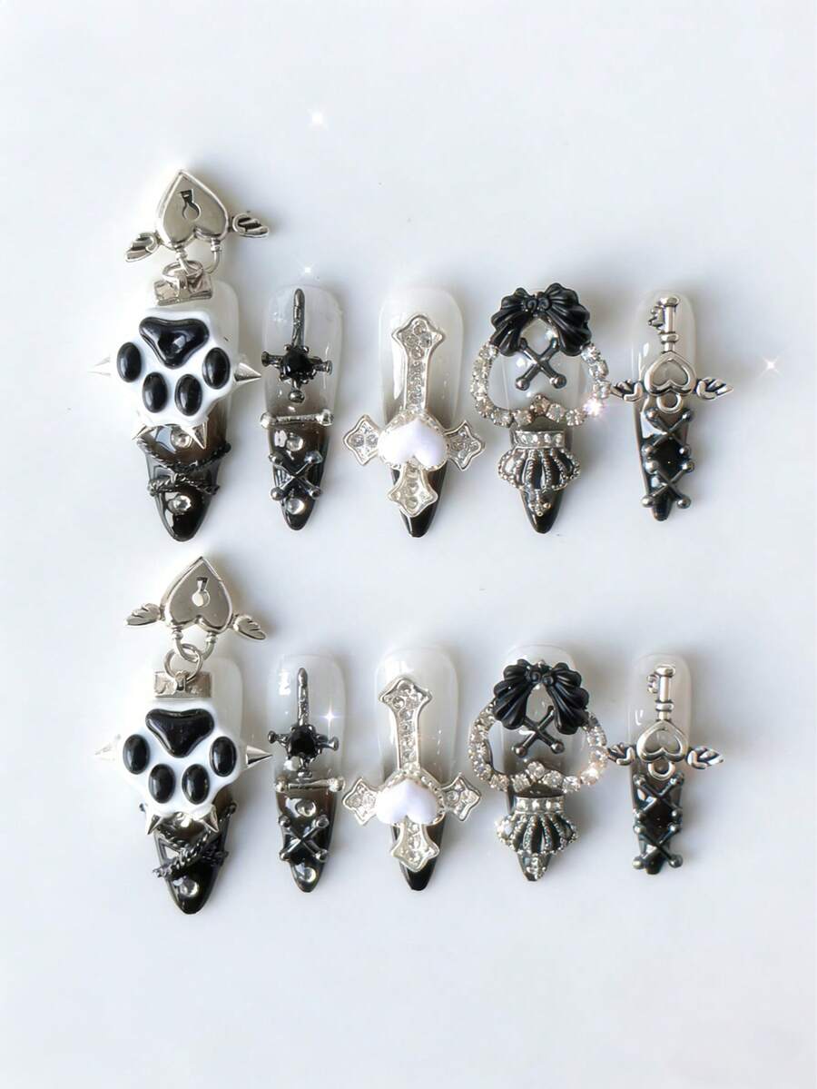 Anime 10 unghie finte di alta qualità realizzate a mano, con elementi in metallo a forma di zampa di gatto e rivetti, stile Y2K con sfumatura graduale nera, forma mandorla media e lunga, rimovibili, adatte per feste, balli e uso quotidiano, con 3 nastri biadesivi inclusi.